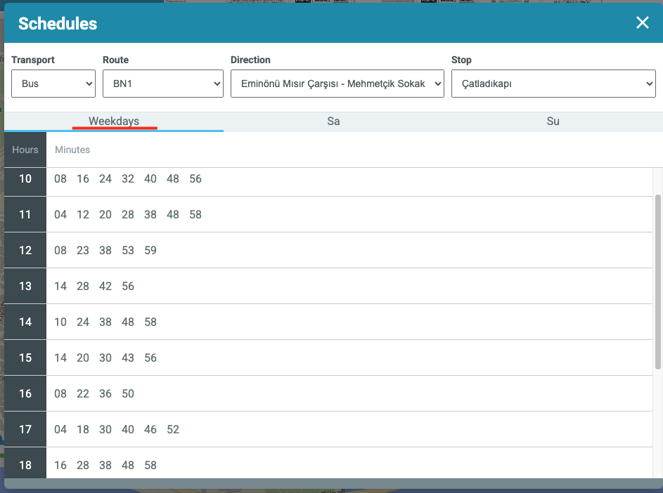 | Helvetia ↓ [M2] Şişhane発 ↓ Halıç Veznecıler - İstanbul Ünıversıtesı ↓ Yenikapı着 ↓ ↓乗り換え ↓ [M1A][M1B]Yenikapı発 ↓ Emnıyet-Fatıh着 | Helvetia ↓ バス停 [32T][79T][89T] [D11][D41][E-56][E-59] Şişhane1発 ↓ Oğuzhan着 |