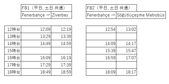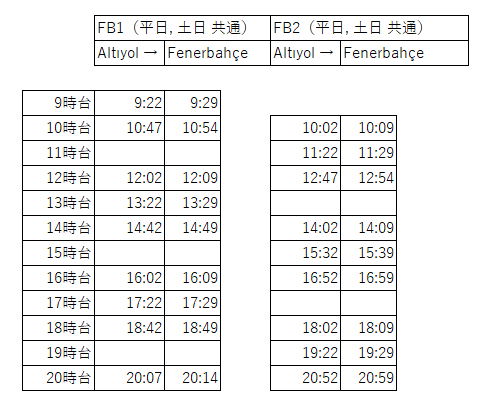 Altıyol発-時刻表 [FB1][FB2] Altıyol発 ↓ [FB1][FB2] Fenerbahçe着 →◆フェネルバフチェ公園 |